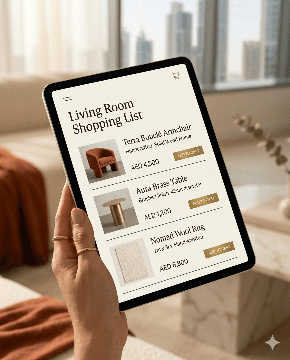 Every piece selected, priced, and linked. Organised room by room. Only UAE retailers.